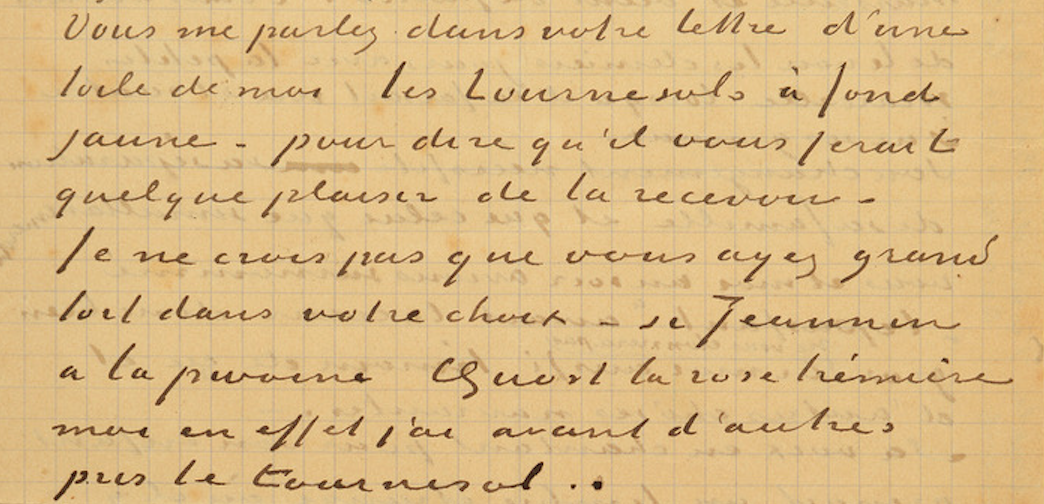 Extract from Van Gogh’s letter to Gauguin, 21 January 1889: “You talk to me in your letter about a canvas of mine, the sunflowers with a yellow background—to say that it would give you some pleasure to receive it. I don’t think that you’ve made a bad choice—if [Georges] Jeannin has the peony, [Ernest] Quost the hollyhock, I indeed, before others, have taken the sunflower.” Musée Réattu, Arles; photograph Hervé Hôte