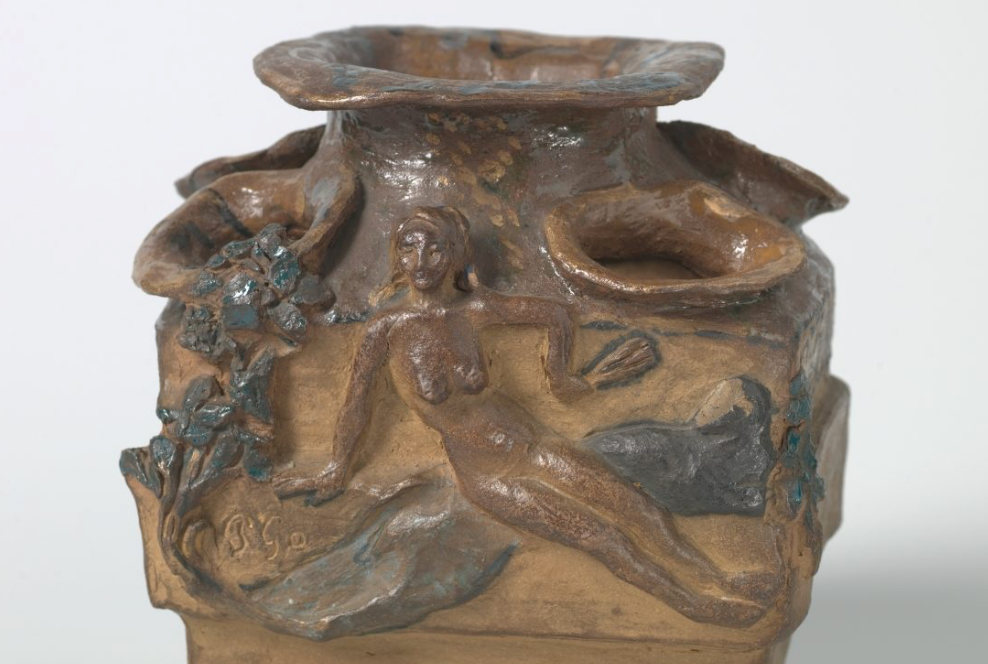 The front of Gauguin’s Cleopatra Pot, with a reclining figure representing the Egyptian queen, behind her (on the right side) a black sheep and with the PGo signature Van Gogh Museum, Amsterdam (Vincent van Gogh Foundation)