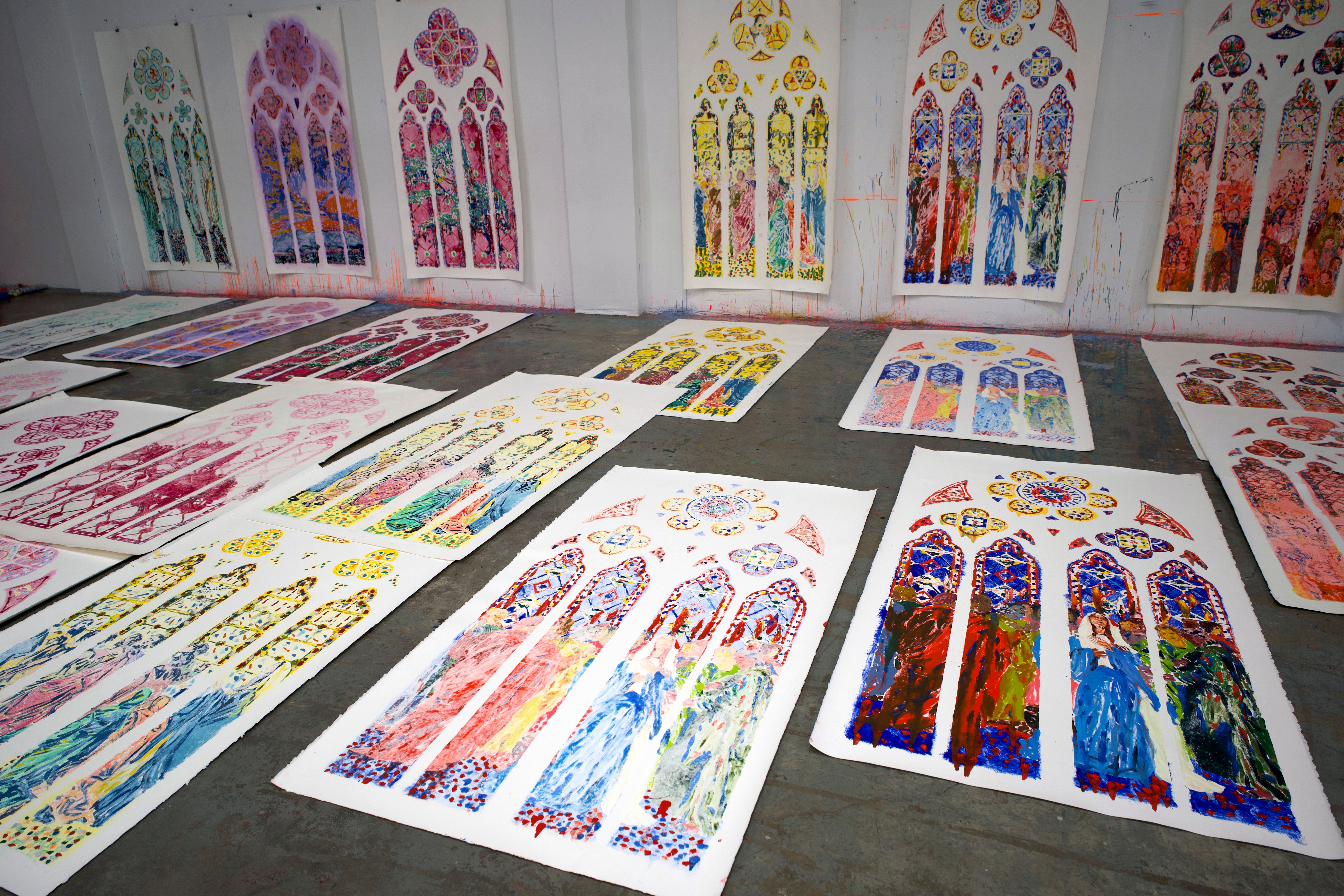 The designs by Tabouret, a 44-year-old who now lives in Los Angeles, were chosen from submissions by over 100 artists. They follow the given brief: the story of the Pentecost when the Holy Spirit appeared at a large gathering and filled each soul. “I’m not religious,” she says, “but it is a story about community and celebration.”